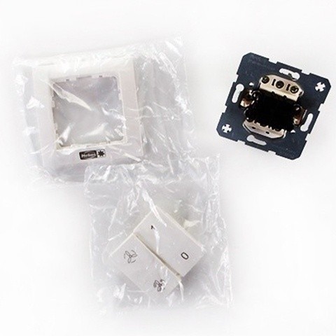 Рабочий переключатель для вентиляторов с 2 режимами мощности. Имеет функции включения/выключения, режимы высокой и низкой скорости вращения. Корпус изготавливается из пластика белого цвета.