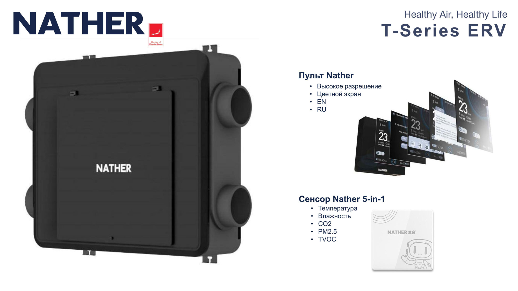 | Опции, подключения, аксессуары | Сенсор Nather 5-in-1: •Температура • Влажность • CO2 • PM2.5 • TVOC |