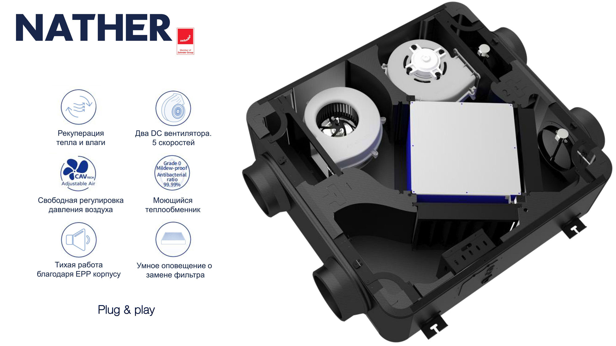 Nather Серия T оснащена современными системами контроля, которые делают эксплуатацию максимально удобной и безопаснойФирменный сенсор 5-в-1: контролирует температуру, влажность, уровень CO2, PM2.5 и TVOC в режиме реального времени.Патентованная автоматическая защита от замерзания: предотвращает обледенение оборудования в условиях суровой зимы.Простое подключение: надежная связь между контроллером сенсором и вентиляционной установкой.Умное напоминание о замене фильтра (для модели T-4a) — стабильная чистота воздуха без лишних забот.Диагностика узлов: система автоматически отслеживает состояние фильтров, теплообменника, вентиляторов и электроники.Мобильное управление через NATHER APP: настройка режимов, скорости и мониторинг параметров прямо со смартфона.БезопасноКомбинация фильтров F8 + H12 — задерживает пыль, пыльцу, споры грибков и аллергенные частицы.ТехнологичноАнтибактериальная обработка — подавляет развитие бактерий и плесени, уровень защиты — 99,99%.ПрактичноМоющийся теплообменник — лёгкое обслуживание и долговечность без дополнительных затрат.Nather Серия T разработана для тех, кто ценит тишину, эффективность и удобство управления.Тишина уровня шёпота — от 22,5 дБ, благодаря корпусу из EPP и оптимизированной аэродинамике.Энергоэффективность класса А — коэффициент утилизации тепла достигает 77%, что позволяет экономить на отоплении и кондиционировании.Компактный и лёгкий монтаж — беспроводное подключение и продуманная конструкция сокращают время установки.Интеллектуальное управление — цветной контроллер, фирменный сенсор 5-в-1 и мобильное приложение NATHER APP обеспечивают полный контроль над микроклиматом, где бы вы ни находились.